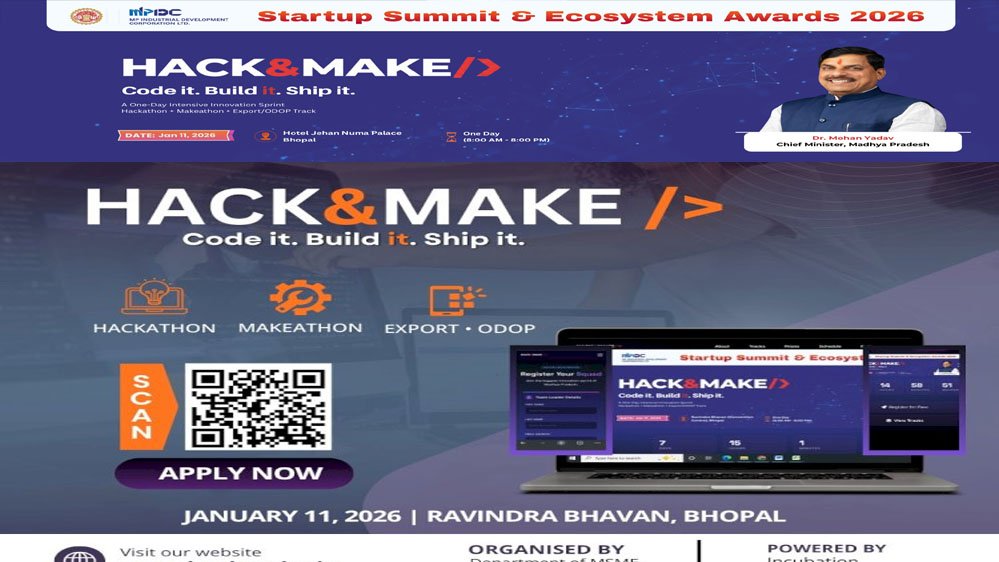 भोपाल में ‘हैक & मेक’ 2026 का आयोजन भोपाल के जहांनुमा पैलेस होटल में 11-12 जनवरी को किया जायेगा। भारत की पहली राज्य-स्तरीय ट्राई-ट्रैक नवाचार का यह अभिनव आयोजन सॉफ्टवेयर विकास, हार्डवेयर प्रोटोटाइपिंग और निर्यात–व्यापार समाधान के क्षेत्रों में एक साथ क्रियान्वयन-आधारित नवाचार को बढ़ावा देगा। मध्यप्रदेश शासन की यह पहल पारंपरिक हैकथॉन से आगे बढ़ते हुए प्रतिभागियों के समक्ष कार्यान्वयन-केन्द्रित मॉडल बनाने की चुनौती प्रस्तुत करती है। प्रतियोगिता में चयनित सॉल्युशंस को वास्तविक धरातल पर लागू करने के लिये अवसर उपलब्ध कराए जायेंगे।