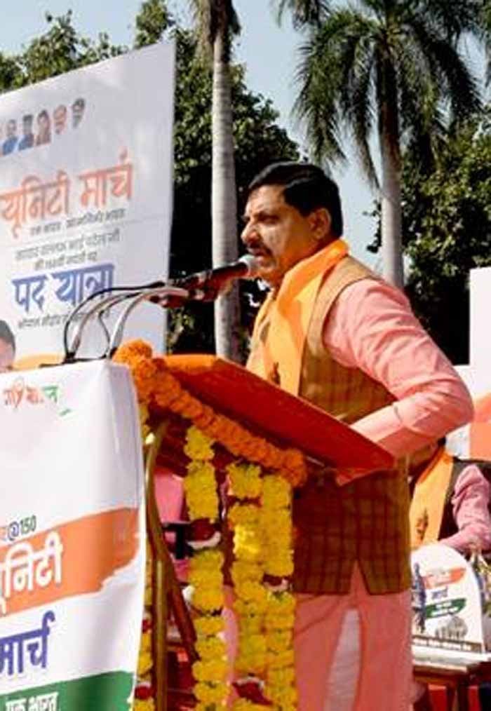 मुख्यमंत्री डॉ. मोहन यादव ने कहा है कि आधुनिक भारत के निर्माण में लौह पुरुष सरदार वल्लभ भाई पटेल की सबसे महत्वपूर्ण भूमिका रही। सरदार पटेल ने अनेकों रियासतों को एक करते हुए अखंड भारत की नींव रखी। उन्होंने देश की विविधता को एकता के सूत्र में पिरोया। आजादी के समय सरदार पटेल ने पाकिस्तान की घटनाओं को दृष्टिगत रखते हुए देश को सुरक्षित रखा। प्रधानमंत्री श्री नरेन्द्र मोदी के नेतृत्व में भारत आज दुनिया के सामने जिस मजबूती के साथ खड़ा है, उसमें सबसे बड़ी भूमिका सरदार पटेल की रही है। सरदार पटेल की 150वीं जयंती से उनके गौरवशाली कार्यों का स्मरण करने के लिए प्रदेश में यूनिटी मार्च का आयोजन किया जा रहा है। मुख्यमंत्री डॉ. यादव सरदार वल्लभ भाई पटेल की 150वीं जयंती पर "एक भारत-आत्मनिर्भर भारत" के लक्ष्य के साथ भोपाल- सीहोर लोकसभा क्षेत्र में निकाले जा रहे यूनिटी मार्च को वल्लभ भवन के सरदार पटेल पार्क में संबोधित कर रहे थे।