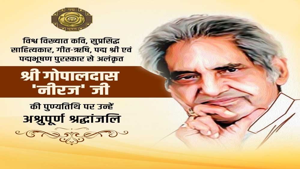 मुख्यमंत्री डॉ. मोहन यादव ने प्रसिद्ध गीतकार, साहित्यकार एवं पद्म भूषण से सम्मानित स्व. गोपालदास 'नीरज' की पुण्यतिथि पर उन्हें विनम्र श्रद्धांजलि अर्पित की। मुख्यमंत्री डॉ. यादव ने कहा कि लोकप्रिय कविताओं के रचियता नीरज जी की कृतियों में देश, समाज और समकालीन परिस्थितियों के साथ संवेदनाओं के सम्मोहक मिश्रण की अनुभूति होती है। उनके द्वारा लिखे गए गीत प्रशंसकों के जीवन को सदैव आनंदित और प्रेरित करते रहेंगे।