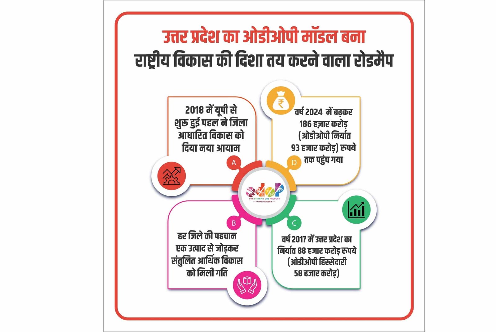 अब उत्तर प्रदेश का ओडीओपी मॉडल देश के अन्य राज्यों के लिए ब्लूप्रिंट के रूप में देखा जा रहा है। जिला आधारित उत्पाद रणनीति ने निर्यात को जमीनी स्तर तक मजबूत किया और छोटे उत्पादक भी वैश्विक आपूर्ति श्रृंखला से जुड़ सके हैं। ओडीओपी योजना की मूल अवधारणा हर जिले की एक विशिष्ट पहचान तय करने की रही है। उत्तर प्रदेश के 75 जिलों में स्थानीय पारंपरिक कला उद्योग या उत्पाद को चिन्हित कर उसे सरकारी संरक्षण में बाजार तक पहुंच और ब्रांडिंग का सहारा दिया गया। मुरादाबाद के पीतल, बनारस की बुनकरी, फिरोजाबाद के कांच, कन्नौज के इत्र और भदोही के कालीन जैसे उत्पादों को इसी सोच के माध्यम से नई पहचान हासिल हुई है।