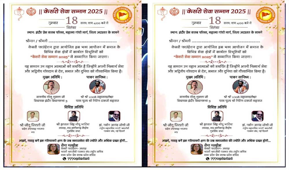 समाज सेवा और राष्ट्र सेवा के विभिन्न क्षेत्रों में उल्लेखनीय योगदान देने वाली 21 प्रतिभाशाली हस्तियों को “केसरी सेवा सम्मान 2025” से अलंकृत किया जाएगा। यह भव्य समारोह 18 सितंबर 2025, शाम 4 बजे इंदौर प्रेस क्लब परिसर में आयोजित होगा।