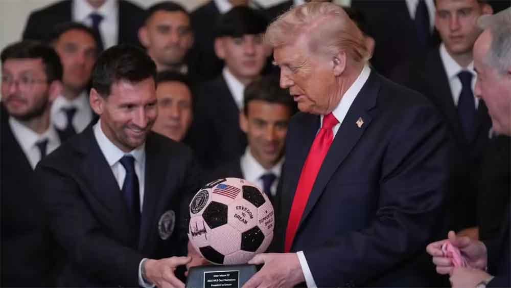 दिग्गज फुटबॉलर लियोनेल मेस्सी ने पिछले साल मेजर लीग सॉकर (एमएलएस) कप जीतने पर इंटर मियामी को सम्मानित करने के लिए व्हाइट हाउस में आयोजित एक समारोह के दौरान अमेरिका के राष्ट्रपति डोनाल्ड ट्रंप को रत्नजड़ित गुलाबी फुटबॉल भेंट की।