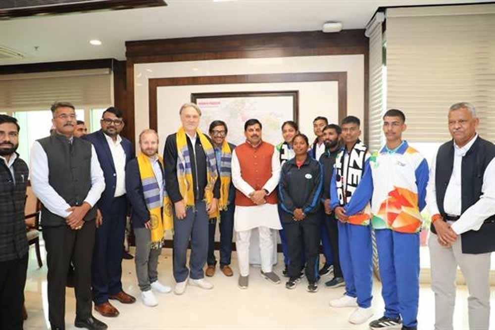 मुख्यमंत्री डॉ. मोहन यादव से शहडोल के ग्राम विचारपुर के फुटबॉल खिलाड़ियों ने मंगलवार को मंत्रालय में भेंट की। खिलाड़ियों के साथ उनके जर्मन प्रशिक्षक डाइटमर बायर्सडार्फर, मैनुअल शेफ़र और खेल संचालक श्री राकेश गुप्ता भी उपस्थित रहे। मुख्यमंत्री डॉ. यादव ने समस्त खिलाड़ियों को उत्कृष्ट प्रदर्शन के लिए बधाई और भावी स्पर्धाओं में सफलता के लिए शुभकामनाएं दीं। मुख्यमंत्री डॉ. यादव ने दोनों अंतर्राष्ट्रीय प्रशिक्षकों का स्वागत किया।