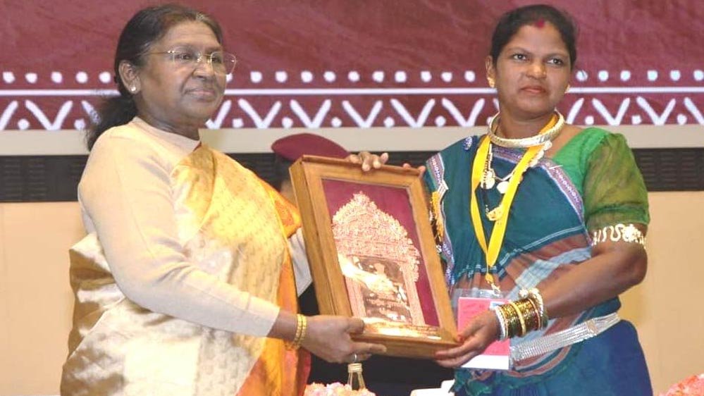 रायपुर : राष्ट्रपति द्रौपदी मुर्मु के हाथों हीराबाई झरेका बघेल राष्ट्रीय हस्तशिल्प पुरस्कार से सम्मानित