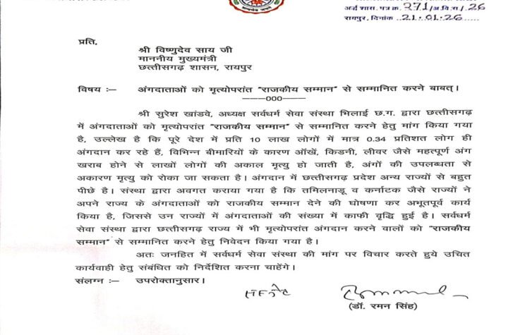 अंगदान को मिले राजकीय सम्मान की मांग: डॉ. रमन सिंह ने मुख्यमंत्री को लिखा पत्र” January 22, 2026 Rashtra Abhiyan News