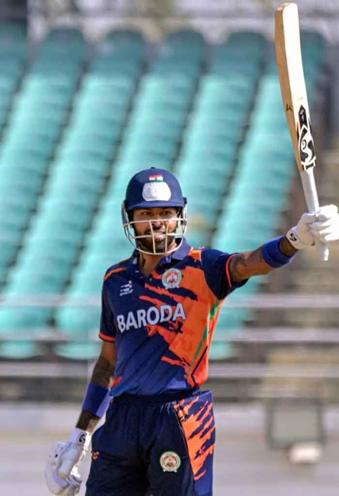 हार्दिक पांड्या ने तीन विकेट लिए, और उन्होंने अपने 10 ओवर पूरे किए। बड़ौदा ने 149 रनों से शानदार जीत हासिल की।