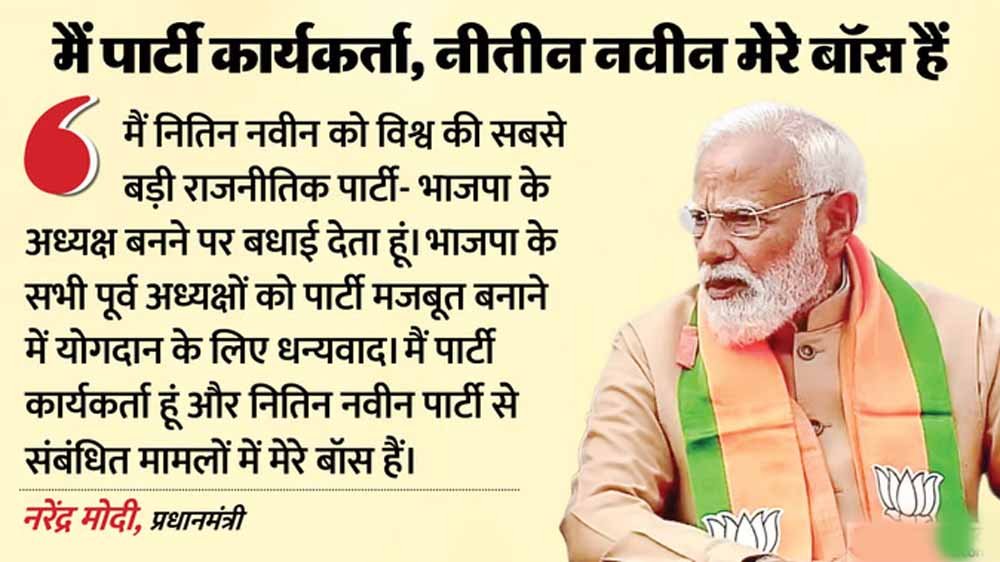 पीएम नरेंद्र मोदी ने कहा, 'नितिन नवीन को केवल भाजपा ही नहीं, एनडीए के घटक दलों से भी समन्वय बनाना है। नितिन ने खुद को साबित किया है।' पीएम मोदी ने कहा कि आने वाले 25 वर्ष बहुत महत्वपूर्ण हैं। आने वाले वर्षों में विकसित भारत का निर्माण होना है और यह तय है। पीएम मोदी ने कहा कि नितिन नवीन मिलेनियल हैं। पीएम ने कहा, 'देश अब 21वीं सदी के एक अहम दौर में प्रवेश कर चुका है। पहले 25 साल तेजी से बीत चुके हैं और अब आने वाले 25 साल बेहद महत्वपूर्ण होने वाले हैं। यही वह समय है, जब विकसित भारत के लक्ष्य को हासिल करना है।