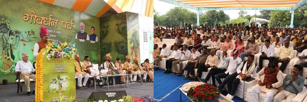 मुख्यमंत्री डॉ. यादव ने गोवर्धन पूजा के राज्य स्तरीय कार्यक्रम में रवीन्द्र भवन में वैदिक मंत्रोच्यारों के बीच गोवर्धन पूजा कर प्रकृति के प्रति मनुष्य के समर्पण को अभिव्यक्त किया। गोवर्धन पर्वत की उपस्थित अतिथियों द्वारा पूजा के बाद आरती भी की गई। इसके पहले मुख्यमंत्री डॉ. यादव का कार्यक्रम स्थल पर साफा पहनाकर स्वागत किया गया। परंपरागत वाद्य यंत्रों पर झूमते युवाओं ने मुख्यमंत्री डॉ. यादव की अगवानी की। मुख्यमंत्री डॉ. यादव ने गौवंश को दुलारा और पशु आहार खिलाया। अन्नकूट की परम्परा के अंतर्गत नया अन्न चढ़ाकर प्रसाद का थाल मुख्यमंत्री डॉ. यादव को भेंट किया गया। मुख्यमंत्री डॉ. यादव को 56 भोग का थाल भेंट किया गया।