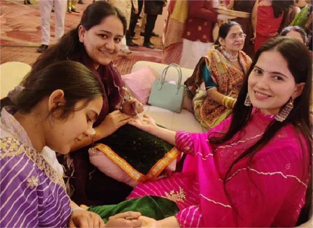 यह तस्वीर कथावाचक इंद्रेश उपाध्याय की मेहंदी सेरेमनी की है। वे प्रसिद्ध कथावाचक कृष्णचंद शास्त्री ठाकुर के बेटे हैं। इस समारोह में कई अतिथि पहुंचे थे, जिनमें जया किशोरी भी शामिल थीं। उन्होंने भी मेहंदी लगवाई, जिसकी तस्वीर अब सोशल मीडिया पर ट्रेंड कर रही है।